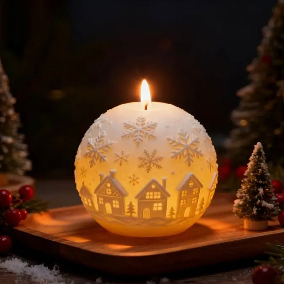 La Bola de Nieve es una vela decorativa hecha a mano con cera de soja 100% natural. Su diseño en forma de esfera está rodeado por delicados copos de nieve en la parte superior y pequeñas casitas en la parte inferior, creando un patrón invernal que transmite calidez y encanto.
