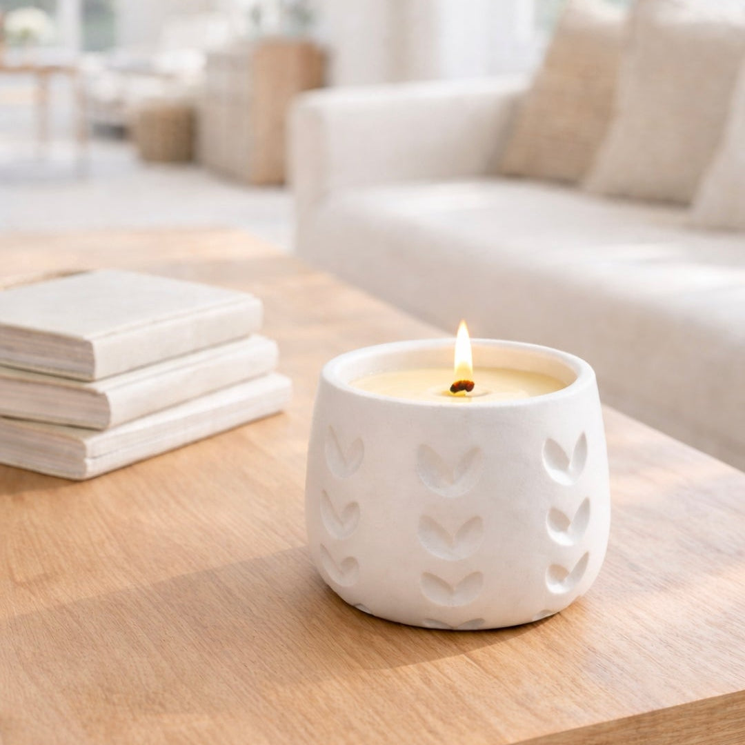 La Vela Calm Heart es una vela pensada para crear ambientes cálidos y delicados. Elaborada con cera de soja 100% natural, se presenta en un recipiente de diseño fabricado con resina ecológica, decorado con pequeños corazones en relieve que aportan un detalle sutil y elegante.